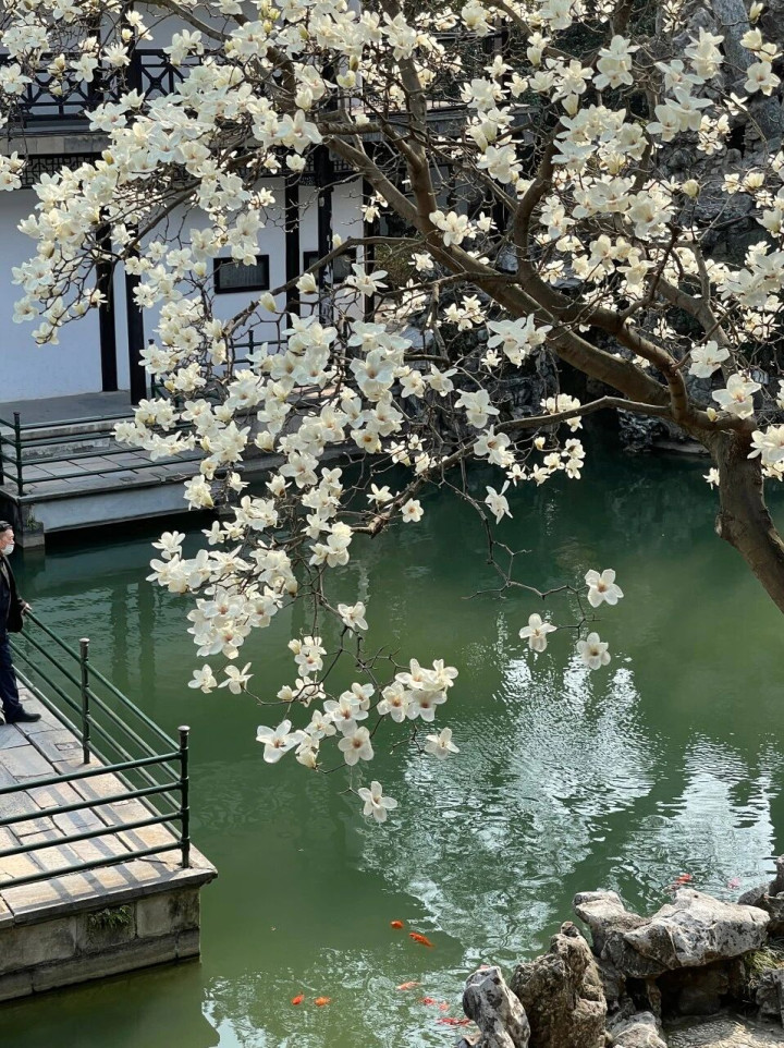 玉兰花与周围的开荒、假山相互衬映,宛如一幅幅吊挂在墙上的紧密丹青,让东说念主不禁惊羡大自然与东说念主类颖异的无缺聚首。
