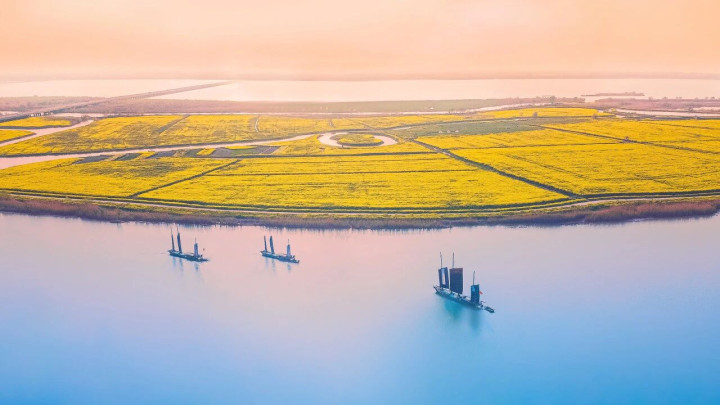 在东说念主们的普遍印象里,油菜花海似乎和扬州并无太多关系。但本体上,在扬州高邮,藏隐着一派足以比好意思婺源的油菜花海。每年春季,这里便成了金色的海洋。千亩油菜花皆皆灵通,在阳光的映照下,能干着金色光泽,与澄澈的湖水相互交汇。水映花黄,花衬水碧,共同绘就一幅栏杆玉砌的“湖上花海”盛景。