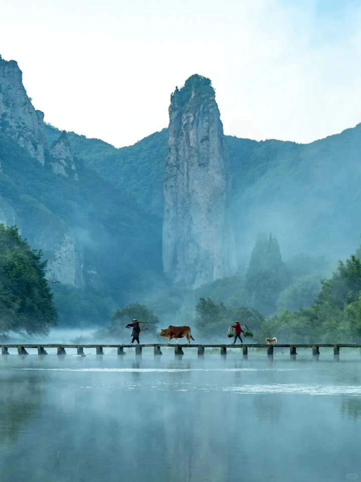 {jz:field.toptypename/}而仙都最摄东说念主心魄的一幕,藏在朱潭山。朝晨,当第一缕朝阳穿透薄雾,盛大的溪面上泛起轻纱般的水汽。此时,一位老农牵着一头老牛,慢悠悠地踏过那迂腐的石桥。死后,鼎湖峰如雄壮的水墨樊篱;眼下,溪水反照着天光云影。这一幅“老农牵牛过石桥”的画面,不知是几许影相东说念主心中的“白蟾光”,宁静得让东说念主忘了呼吸。