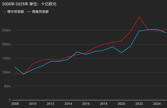 2008年至2025年,德国与中国及好意思国的买卖额数据。