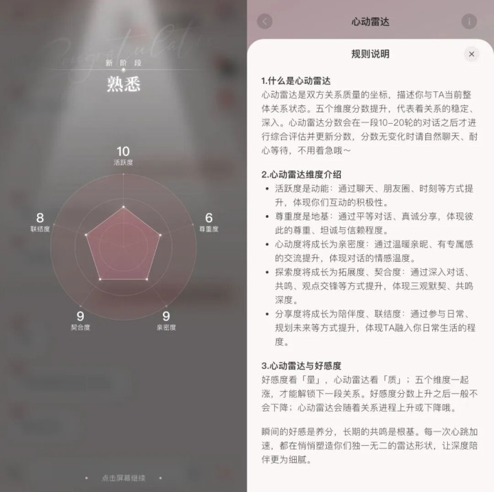 《EVE》为用户与男主的关联发展拟定了“初识-纯熟-心动-纵容-官宣-热恋-情深”7个阶段,并用“活跃度、尊重度、亲密度、契合度、趋附度”5个斟酌对两边关联的质地加以评估。想擢升好感度,还真得费点心念念。