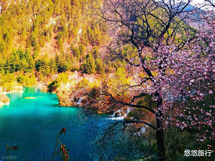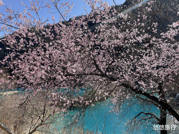 一半桃花,一半雪景。3月中旬-4月初是九寨沟的桃花季,就算是枯水期,景不雅也终点丰富。